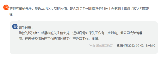 西藏高爭民爆針對投資者提出的西藏地區(qū)反復(fù)的疫情是否川藏鐵路相關(guān)工程施工造成較大影響回復(fù)稱,近期疫情對保供工作有一定影響,但公司會統(tǒng)籌兼顧,在做好疫情防控工作的同時抓實生產(chǎn)經(jīng)營工作。