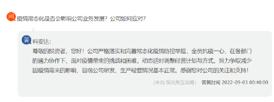 深圳從事軌道交通產(chǎn)品研發(fā)、生產(chǎn)、銷售的科安達回復(fù)公司嚴格落實和完善常態(tài)化疫情防控舉措,全員抗疫一心,在各部門的通力協(xié)作下,面對疫情帶來的挑戰(zhàn)和困難,動態(tài)適時調(diào)整經(jīng)營計劃與方式,努力爭取減少因疫情帶來的影響,目前公司研發(fā)、生產(chǎn)經(jīng)營情況基本正常。