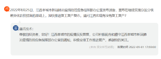 江西道氏技術(shù)回復(fù)投資者稱,江西豐城市的疫情反反復(fù)復(fù),公司積極配合和遵守江西豐城市新冠肺炎疫情防控應(yīng)急指揮部辦公室的通知,積極安排工作推進復(fù)產(chǎn)。