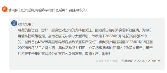 聯(lián)創(chuàng)光電回復(fù),因為近日哈爾濱突發(fā)新冠疫情,為遵守疫情防控政策規(guī)定,當(dāng)?shù)鼐频隉o法承辦大型活動,故原定于2022年9月6日在哈爾濱舉辦的“世界首臺MW級高溫超導(dǎo)感應(yīng)加熱裝置投產(chǎn)儀式”初步預(yù)計將延期至2022年9月18日至2022年9月28日之間舉行,具體活動舉辦日期,公司將根據(jù)當(dāng)?shù)匾咔榉揽卣邅泶_定。
