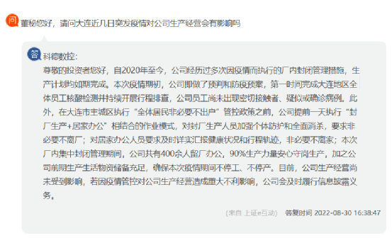 科德數(shù)控回復(fù)稱,本次疫情期初,公司即做了預(yù)判和防疫預(yù)案,第一時間完成大連地區(qū)全體員工核酸檢測并持續(xù)開展行程排查,公司員工尚未出現(xiàn)密切接觸者、疑似或確診病例。此外,在大連市主城區(qū)執(zhí)行“全體居民非必要不出戶”管控政策之前,公司提前一天執(zhí)行“封廠生產(chǎn)+居家辦公”相結(jié)合的作業(yè)模式,對封廠生產(chǎn)人員加強個體防護和全面消殺,要求非必要不離廠;對居家辦公人員要求及時詳實匯報健康狀況和行程軌跡,非必要不離家;本次廠內(nèi)集中封閉管理期間,公司共有400余人留廠辦公,90%生產(chǎn)力量安心守崗生產(chǎn),加之公司前期生產(chǎn)生活物資儲備充足,確保本次疫情期間不停工、不停產(chǎn)。目前,公司生產(chǎn)經(jīng)營尚未受到影響。