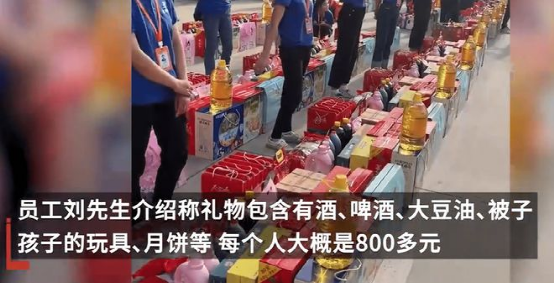 9月9日,江蘇徐州。一公司花費(fèi)27萬左右給300名工人每人發(fā)放了30件中秋禮品。公司劉先生稱,每個(gè)人禮品價(jià)值大概是800多元,公司逢年過節(jié)就這樣,為此還遭到了同行的投訴。福利太好了,工人在公司的地位很重要,領(lǐng)導(dǎo)和工人都來自農(nóng)村,逢年過節(jié)送點(diǎn)福利,也是希望工人開心。