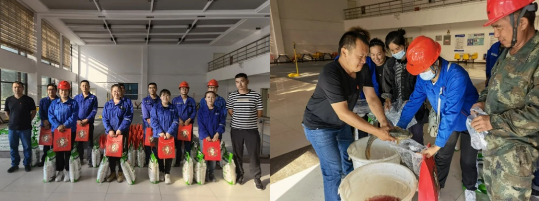 工會(huì)主席袁康林興奮的為員工裝魚,“快來,袋子接好嘍,魚要跑了!”大家圍在一起,歡快的笑聲在職工食堂回蕩。
