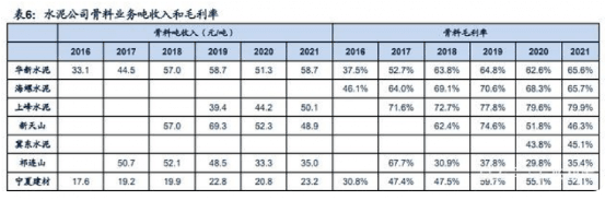 骨料資源屬性帶來高盈利壁壘,區(qū)域間有明顯分化。一方面,2016~2019年由于環(huán)保等因素關(guān)停大量小礦山,在淘汰落后產(chǎn)能的同時、新增產(chǎn)能補充不及時,礦山數(shù)量和砂石產(chǎn)量明顯減少,造成骨料供需短期失衡,價格大幅上漲。全國砂石骨料均價從2016年的46元/噸漲至2020年的100元/噸以上。海螺水泥骨料毛利率從2016年的46%升至2021年的68.34%;華新骨料業(yè)務(wù)毛利率從2016年的37.5%上漲至2021年的65.6%;上峰水泥2021年砂石骨料毛利率高達(dá)79.92%……