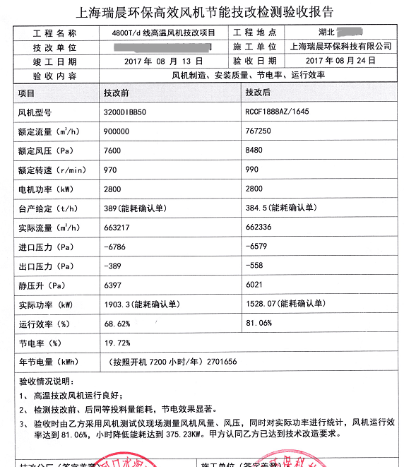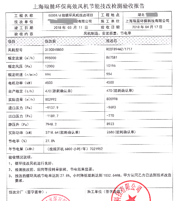 表2 循環(huán)風(fēng)機(jī)改造前后對(duì)和技改驗(yàn)收?qǐng)?bào)告