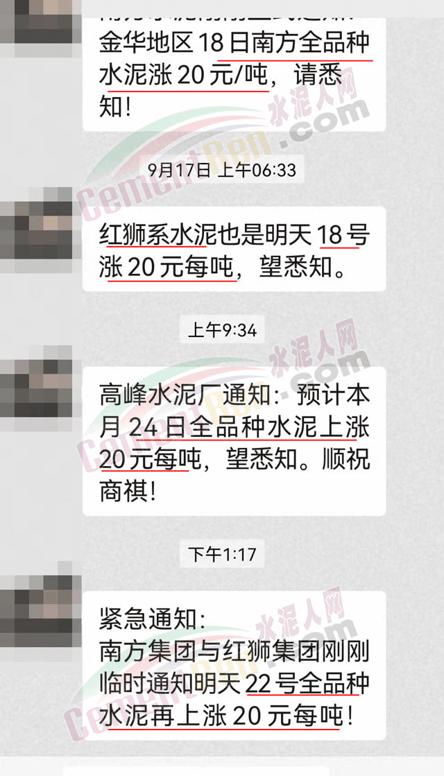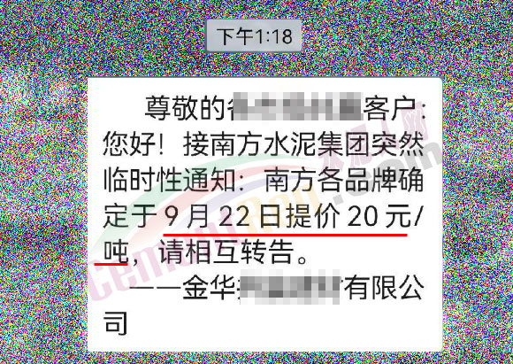 水泥人網(wǎng)通訊員消息,21日下午金華區(qū)域經(jīng)銷商收到通知,紅獅水泥、南方水泥通知自22日起水泥價格上調(diào)20元/噸。據(jù)了解,區(qū)域內(nèi)紅獅水泥、南方水泥曾于18日上調(diào)水泥價格20元/噸,兩次累計上調(diào)40元/噸。