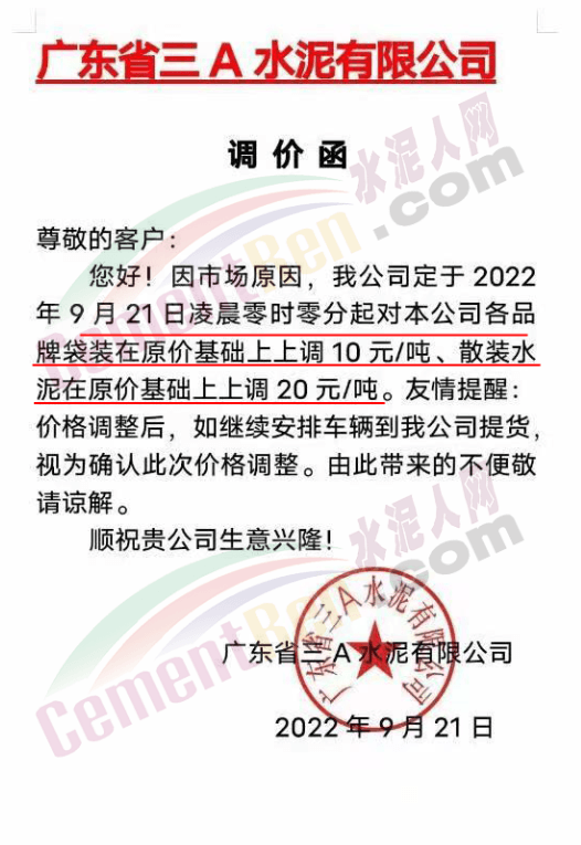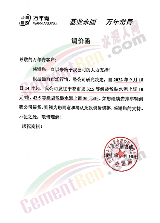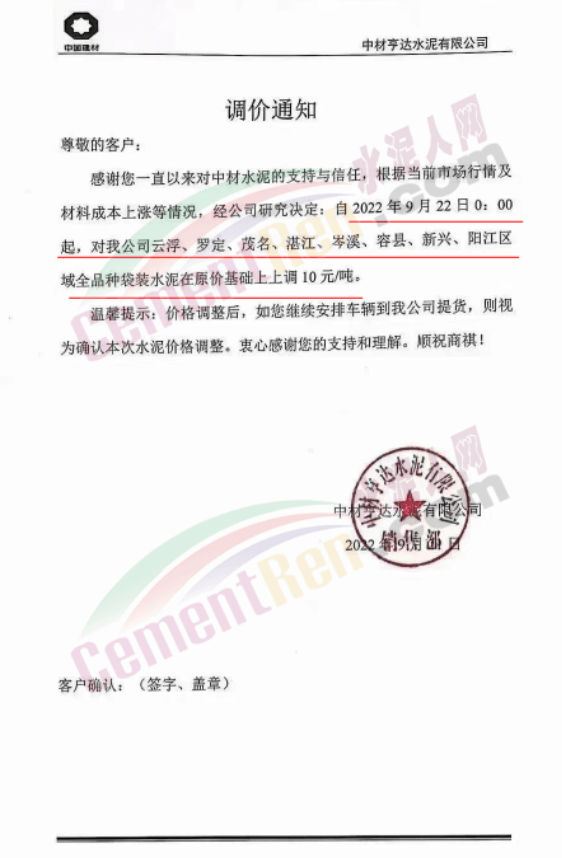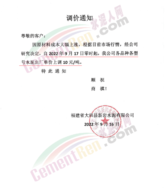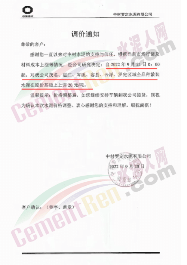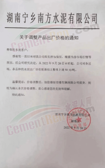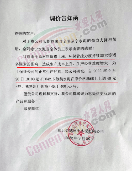 同期,河北多地主要品牌企業(yè)通知再次上調(diào)水泥價格。邢臺金隅詠寧水泥通知目前由于原材料價格上漲,環(huán)保管控力度持續(xù)加大等諸多因素的影響,造成生產(chǎn)成本上升,生產(chǎn)經(jīng)營難度增大。為了保證公司的正常生產(chǎn)經(jīng)營,經(jīng)公司研究,自2022年9月20日18∶00起,P.O42.5散裝水泥在原價格基礎上上調(diào)40元/噸,熟料出廠價格不低于400元/噸。