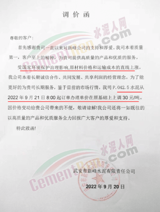 武安新峰水泥通知,受國家環(huán)境保護治理影響,原材料價格和運輸成本直線上漲,鑒于目前的市場行情,公司P.O42.5水泥從2022年9月21日8∶00起訂單辦理單價在原基礎上上調(diào)30元。