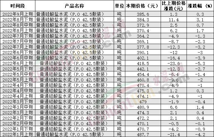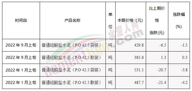 國家統(tǒng)計局數(shù)據(jù)顯示,今年1月上旬至9月上旬,流通領域普通硅酸鹽水泥(P.O 42.5散裝)價格下跌了102.1元/噸,普通硅酸鹽水泥(P.O 42.5袋裝)價格下跌了101.3元/噸,均超過100元/噸。