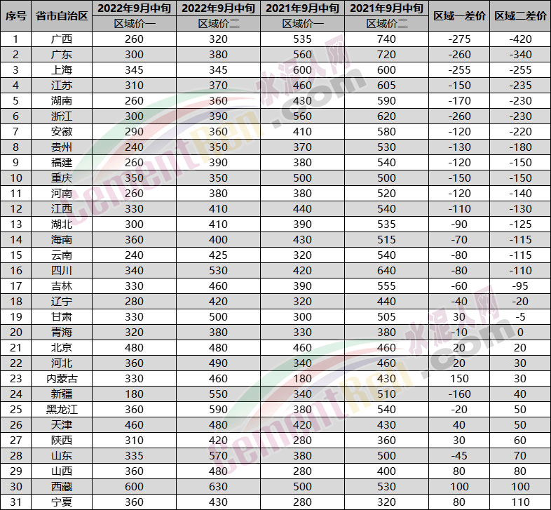 半數(shù)以上的區(qū)域水泥價格同比上年下跌,疊加煤炭價格仍較堅挺,且多區(qū)域即將進入四季度趕工期,水泥需求或?qū)⒊霈F(xiàn)小幅增加,各大水泥企業(yè)復價意愿強烈,水泥價格有望進入上行通道。