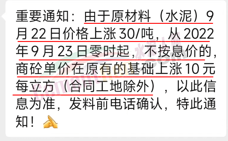 同時,下游商砼企業(yè)發(fā)重要通知稱,由于原材料(水泥)9月22日價格上漲30/噸,從2022年9月23日零時起,不按息價的,商砼單價在原有的基礎上漲10元每立方(合同工地除外), 發(fā)料前電話確認 。