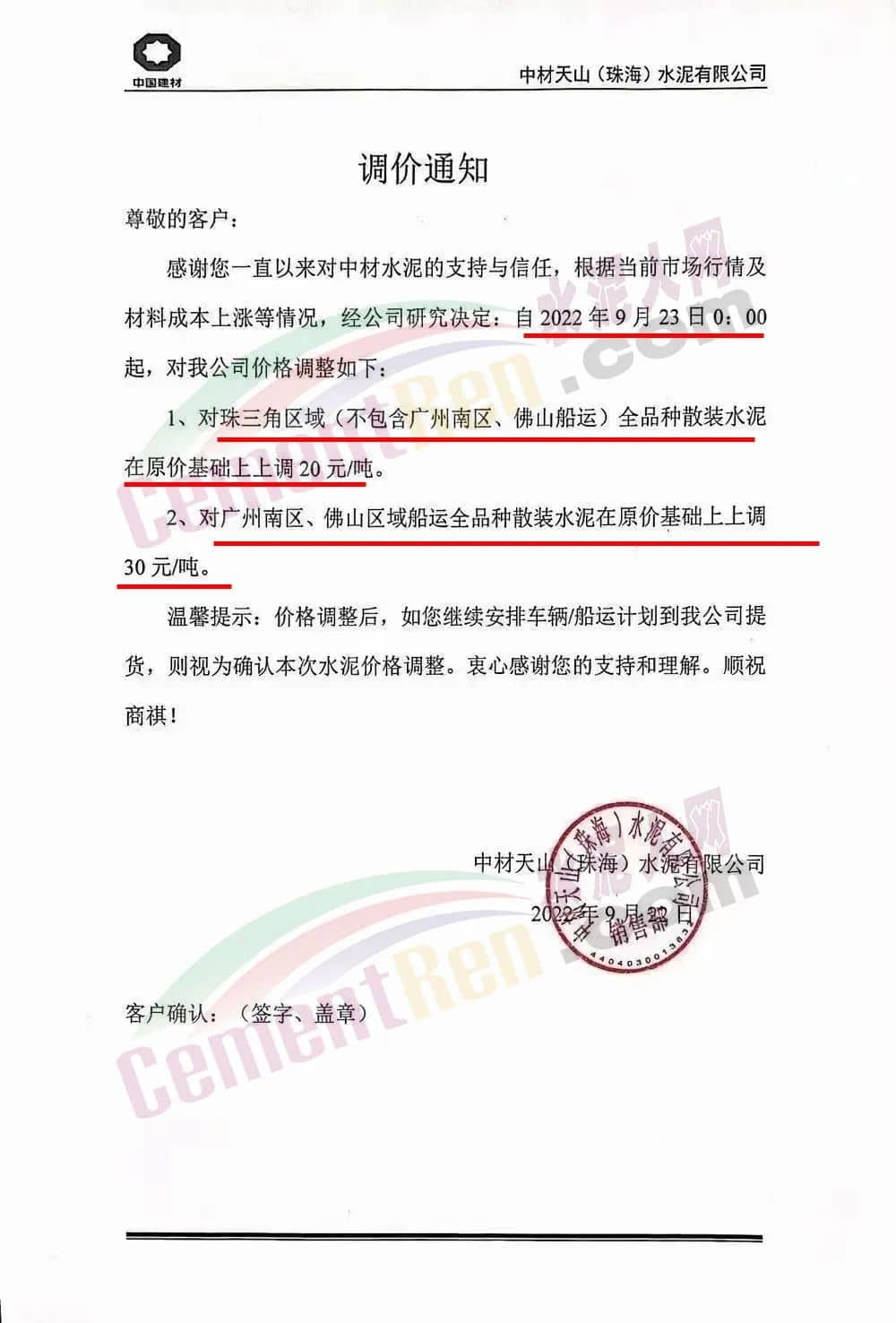 中材天山(云浮)水泥有限公司、中材天山(珠海)水泥有限公司等通知,自9月23日0時起對珠三角區(qū)域不包括廣州南區(qū)和佛山船運,全品種散裝水泥在原價基礎上上調20元/噸。對廣州南區(qū)、佛山區(qū)域船運全品種散裝水泥上調30元/噸。
