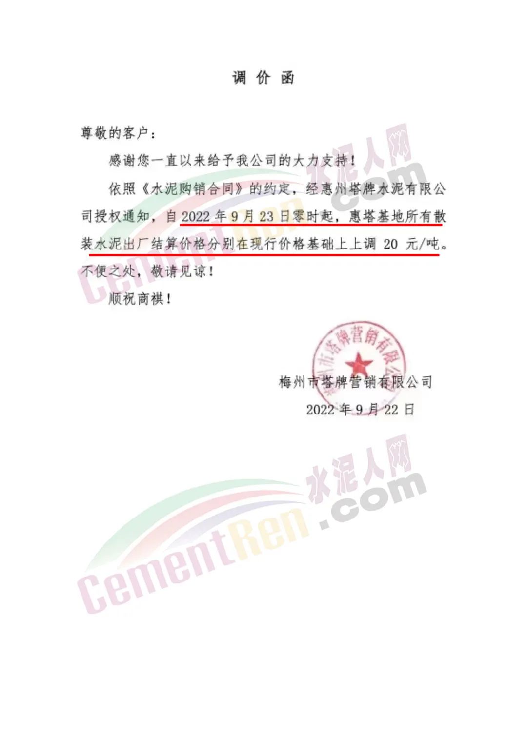 梅州市塔牌營銷有限公司通知,自9月23日零時起,惠塔基地所有散裝水泥出廠結算價在現(xiàn)行基礎上上調20元/噸。