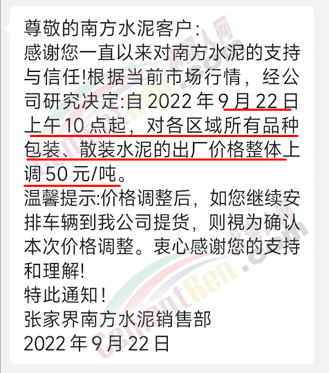 張家界南方水泥銷售部通知,經(jīng)公司研究決定自2022年9月22日上午10點起,對各區(qū)域所有品種包裝、散裝水泥的出廠價格整體上調50元/噸。