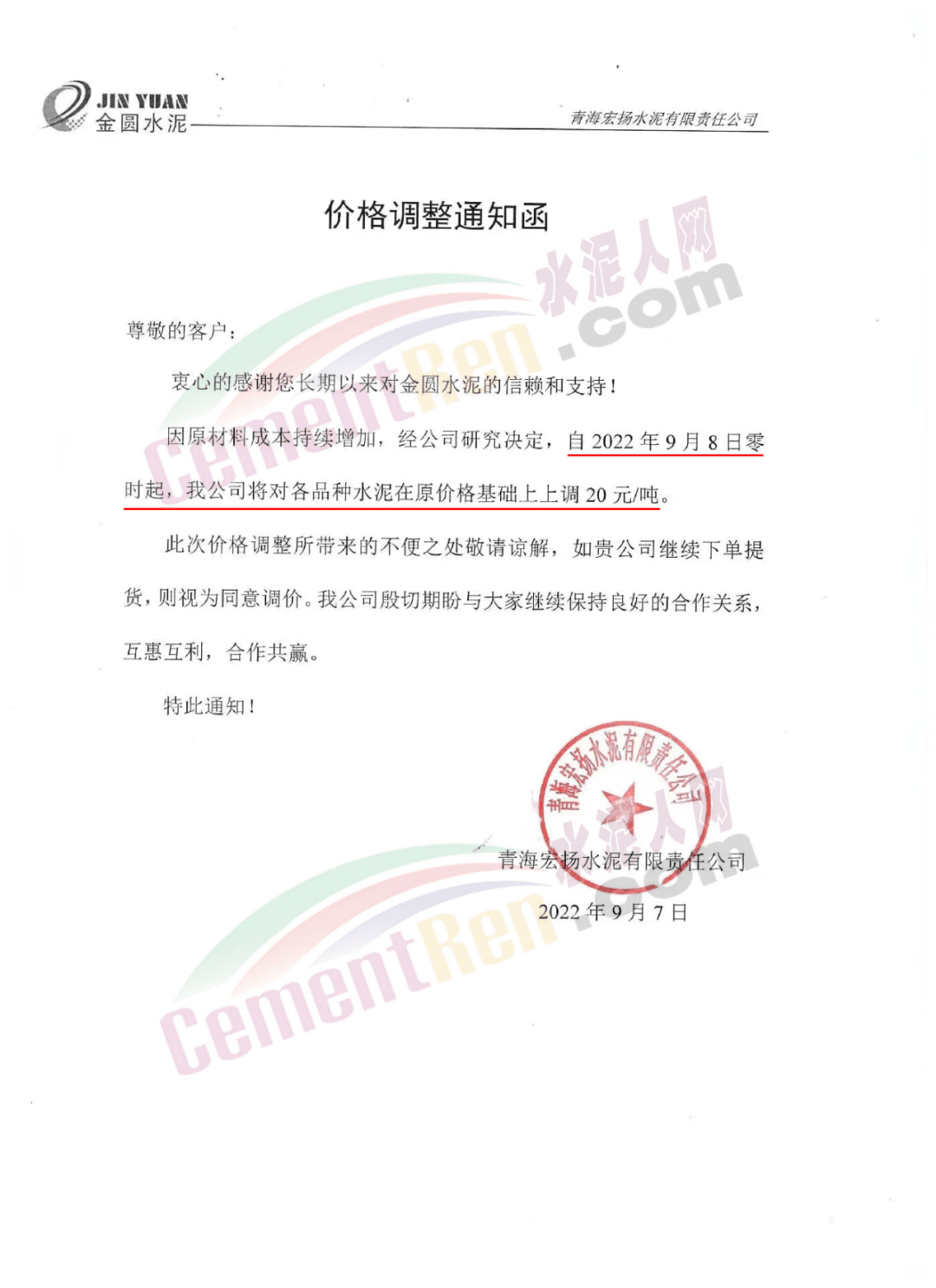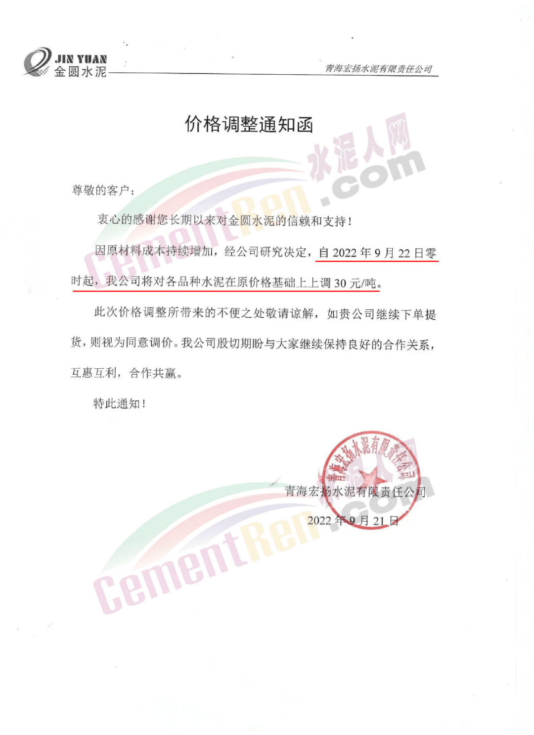 青海宏揚水泥有限責任公司通知,因原材料成本持續(xù)增加,經(jīng)公司研究決定自9月22日零時起,公司將對各品種水泥在原價基礎上上調30元/噸。據(jù)水泥人網(wǎng)了解,這是該企業(yè)本月內第二次上調水泥價格,兩次累計上調50元/噸。