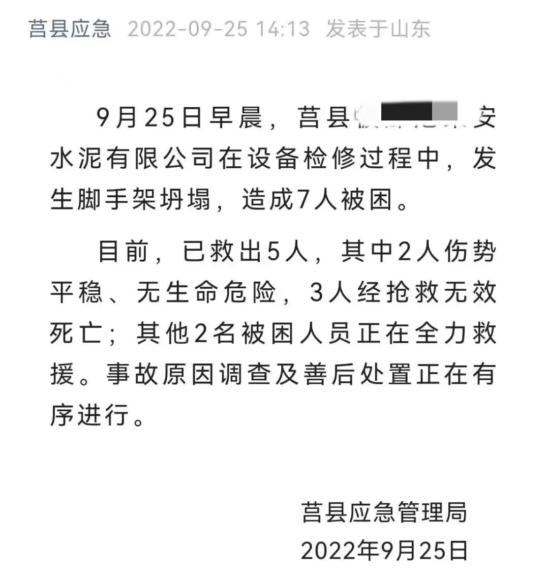 9月25日,莒縣應急官微發(fā)布消息,莒縣某安水泥有限公司在設備檢修過程中,發(fā)生腳手架坍塌,造成7人被困。