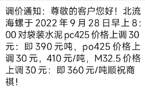 據(jù)經(jīng)銷商反饋,海螺水泥銷售經(jīng)理及經(jīng)銷商多在群里或公眾社交媒體上發(fā)布調(diào)價消息,但是落實到電商系統(tǒng)里的時間與通知時間偶爾也會有出入。