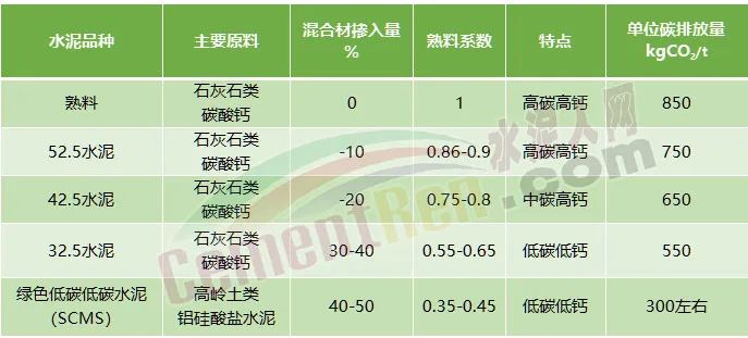 上述表格中列出的綠色低碳低鈣水泥,強度等級是32.5,特點是低碳低鈣低熟料系數(shù),國際上統(tǒng)稱為新型低碳膠凝材料Supplementary Cementitious Materials (SCMs),直譯為補充型水泥質(zhì)材料。