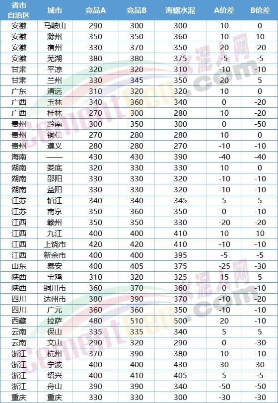 各區(qū)域海螺水泥與競品報價對比