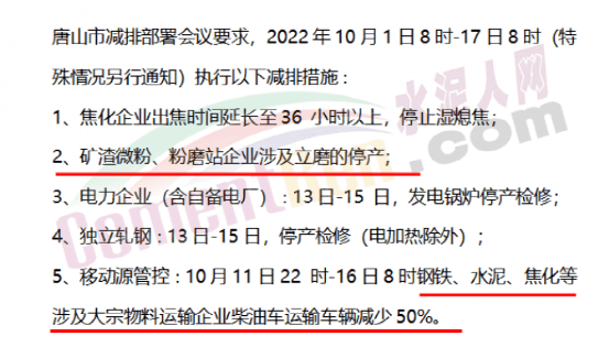 據(jù)水泥人網(wǎng)通訊員消息,河北省唐山市減排部署會(huì)議要求,2022年10月1日8時(shí)-17日8時(shí)執(zhí)行減排措施∶礦渣微粉、粉磨站企業(yè)涉及立磨的停產(chǎn);10月11日22時(shí)至-16日8時(shí)鋼鐵、水泥、焦化等涉及大宗物料運(yùn)輸企業(yè)柴油車運(yùn)輸車輛減少50%。