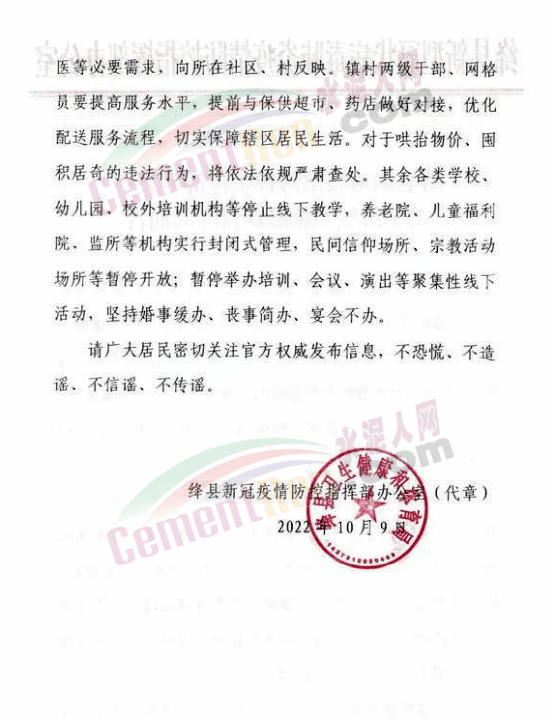 與山西內(nèi)蒙接壤的河北省張家口市近來也出現(xiàn)散發(fā)疫情。部分區(qū)域?qū)嵤┡R時(shí)管控。據(jù)當(dāng)?shù)?a href="http://www.lcgyank.cn/news/list_2.html" target="_blank" class="keylink">水泥企業(yè)反饋,日前收到緊急通知稱,按防疫指揮部要求,10月11日零點(diǎn)開始,全市封城,請(qǐng)各企業(yè)抓緊在今天下午準(zhǔn)備好三天的物資(吃住用),需要生產(chǎn)的所有企業(yè)一律全封閉式待在企業(yè),企業(yè)員工在企業(yè)吃住,不準(zhǔn)出門,至少住三天以上,其余不需要生產(chǎn)的企業(yè)通知員工做好居家管理。凌晨后馬路上不能見到一車一人,所有路段實(shí)行了物理隔離。