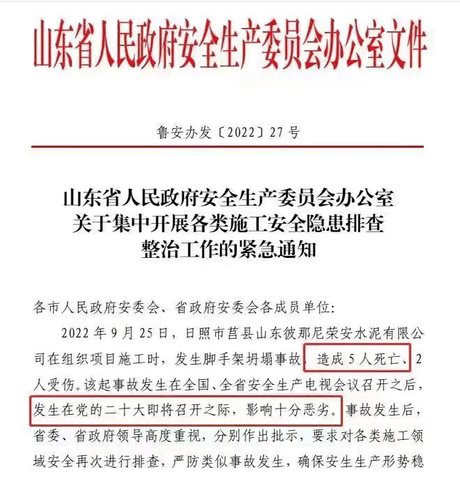 2022年9月25日,日照市莒縣山東彼那尼榮安水泥有限公司在組織項(xiàng)目施工時(shí),發(fā)生腳手架坍塌事故,造成5人死亡、 2人受傷。該起事故發(fā)生在全國(guó)、全省安全生產(chǎn)電視會(huì)議召開之后,影響十分惡劣。