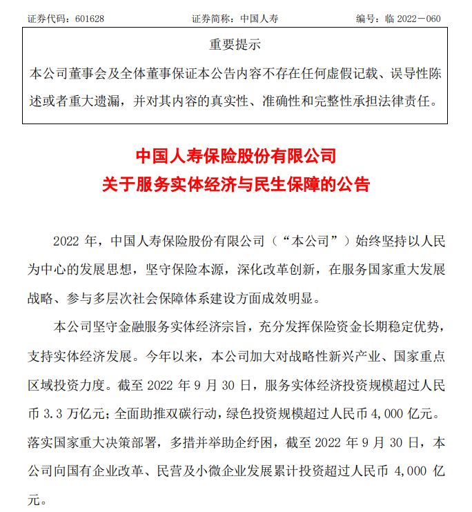 除國有大行外,中國人壽保險16日也發(fā)布公告稱,充分發(fā)揮保險資金長期穩(wěn)定優(yōu)勢,支持實(shí)體經(jīng)濟(jì)發(fā)展。截至9月末,該公司服務(wù)實(shí)體經(jīng)濟(jì)投資規(guī)模超過人民幣3.3萬億元;在全國承辦200多個大病保險項(xiàng)目,覆蓋近3.5億人。