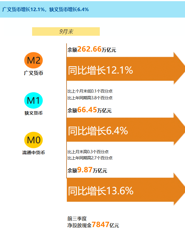 9月末,廣義貨幣(M2)余額262.66萬億元,同比增長12.1%,增速比上月末低0.1個百分點(diǎn),比上年同期高3.8個百分點(diǎn);狹義貨幣(M1)余額66.45萬億元,同比增長6.4%,增速分別比上月末和上年同期高0.3個和2.7個百分點(diǎn);流通中貨幣(M0)余額9.87萬億元,同比增長13.6%。前三季度凈投放現(xiàn)金7847億元。