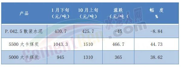 國家統(tǒng)計局?jǐn)?shù)據(jù)顯示,今年1月下旬至10月上旬 P.O42.5散裝水泥市場均價下跌45元/噸,跌幅為8.84%;5500大卡煤炭價格卻上漲了466.7元/噸;5000大卡煤炭價格上漲了365元/噸;漲幅分別為44.73%和38.62%。