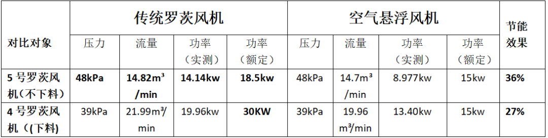 企業(yè)相關(guān)負(fù)責(zé)人對水泥人網(wǎng)表示,原先使用的4號(hào)庫和5號(hào)庫這兩臺(tái)羅茨風(fēng)機(jī)存在嚴(yán)重的壓力不穩(wěn)定、效率低、電耗高、運(yùn)行時(shí)噪音過高、維護(hù)費(fèi)用高等問題,在技改成濰坊富源的空氣懸浮風(fēng)機(jī)后,在節(jié)能降本領(lǐng)域?qū)崿F(xiàn)了巨大突破。其中,4號(hào)風(fēng)機(jī)節(jié)能效果達(dá)到27%,5號(hào)風(fēng)機(jī)節(jié)能效果達(dá)到36%。