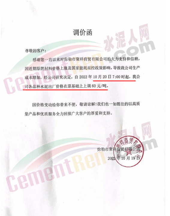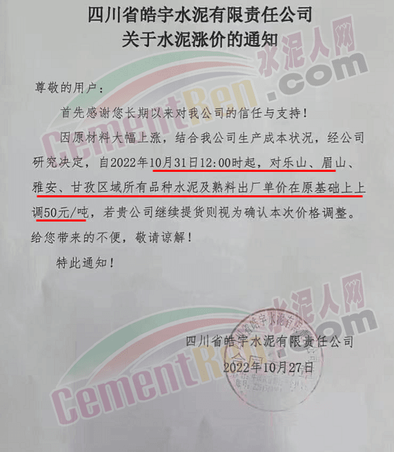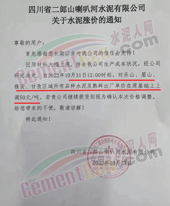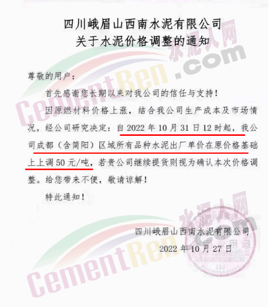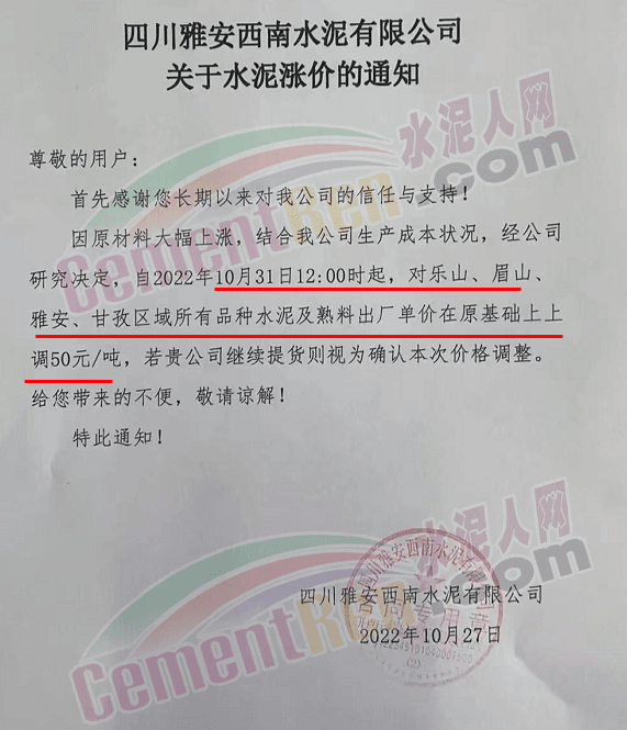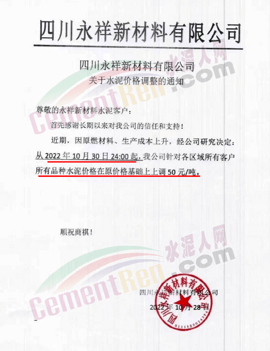 四川永祥新材料通知,10月30日24時起,水泥價格上調50元/噸。