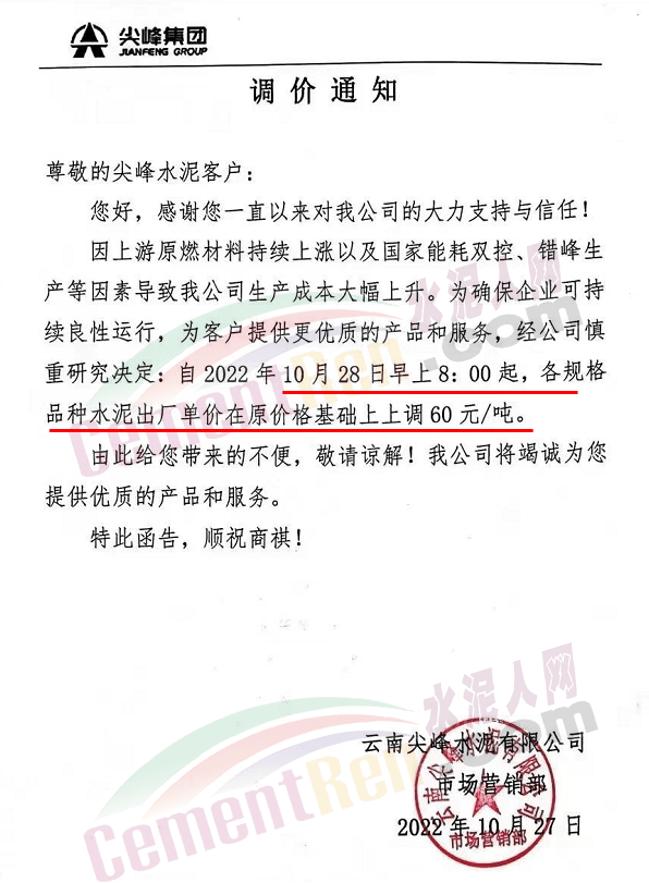 云南尖峰水泥通知10月28日早8時起,水泥價格上調60元/噸。