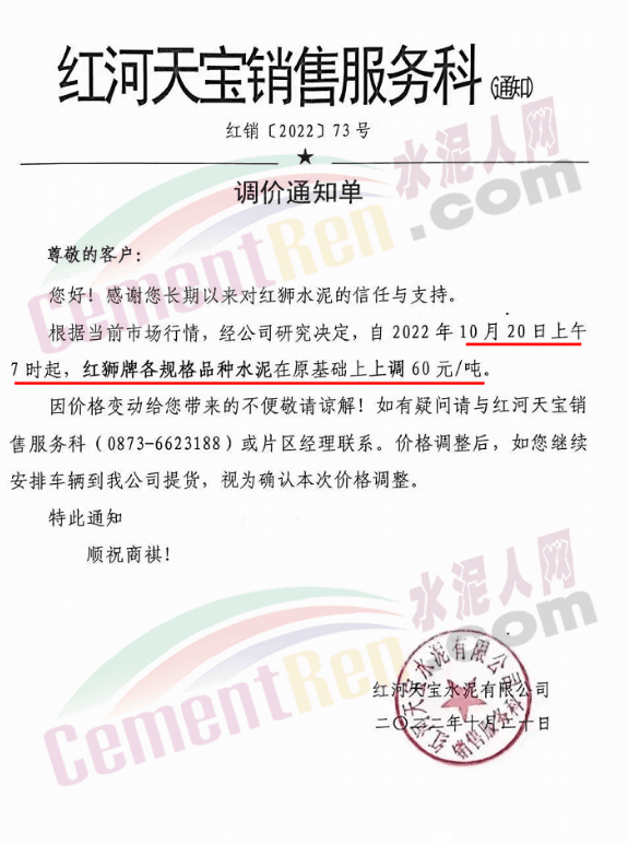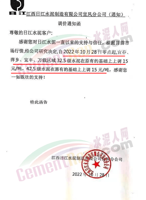 江西日江水泥通知,10月28日 零點起宜春、萍鄉(xiāng)、宜豐、萬載區(qū)水泥價格上調15元/噸。