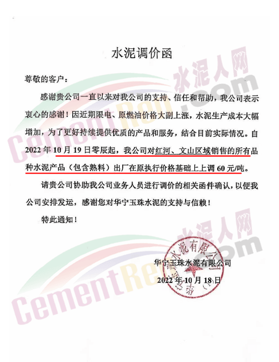 據水泥人網了解,10月下旬以來,云南區(qū)域已有多家品牌企業(yè)通知上調水泥價格60元/噸。