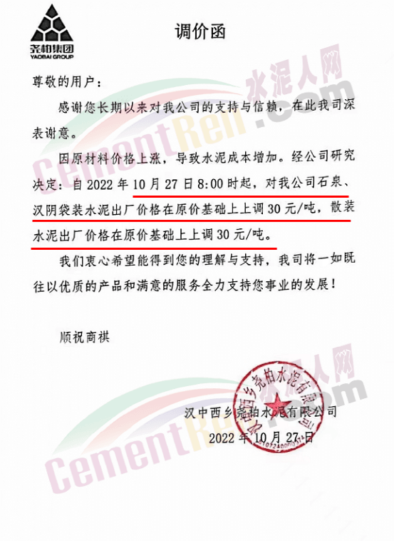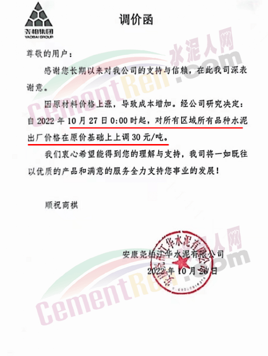陜西安康堯柏江華水泥通知10月27日0時起,水泥價格上調30元/噸。