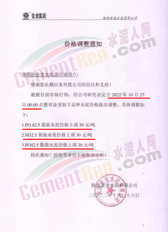 陜西金龍水泥通知10月27日0時起,水泥價格上調30元/噸。