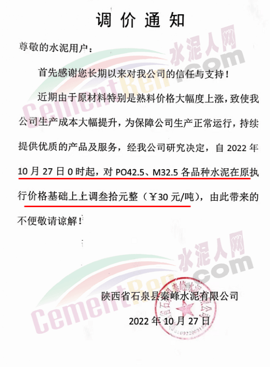 陜西秦峰水泥通知,10月27日 0時起,水泥價可行上調30元/噸。