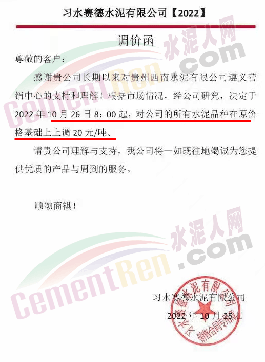 貴州習水賽德水泥通知,10月26日8時起,上調20元/噸。
