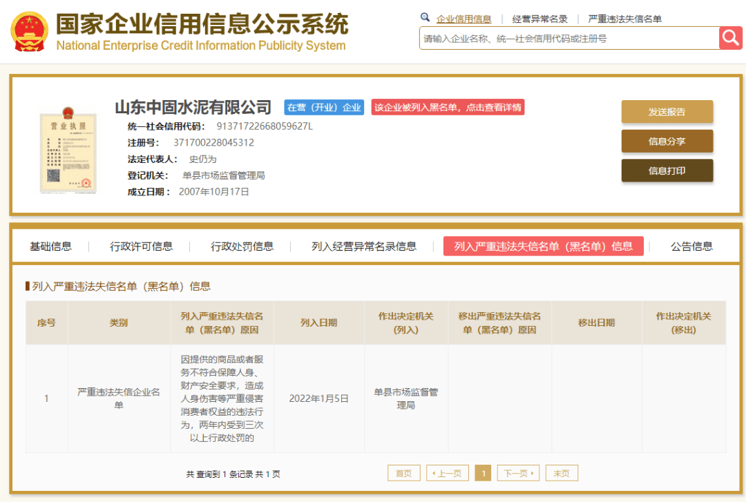 今年3月中旬,國(guó)家市場(chǎng)監(jiān)管總局曾集中曝光一批嚴(yán)重違法失信名單典型案例涉及食品、重要工業(yè)產(chǎn)品和知識(shí)產(chǎn)權(quán)等領(lǐng)域。其中包括山東中固水泥有限公司生產(chǎn)不合格水泥案。