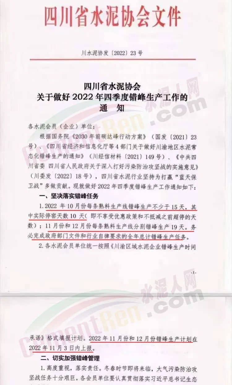 日前,四川省水泥協(xié)會(huì)發(fā)布《關(guān)于做好2022年四季度錯(cuò)峰生產(chǎn)工作的通知》提到10月份每條熟料生產(chǎn)線錯(cuò)峰生產(chǎn)不少于15天,其中實(shí)際停窯天數(shù)10天。(即不享受優(yōu)惠政策和不抵減之前超停的天數(shù));11月份和12月份每條熟料生產(chǎn)線分別錯(cuò)峰生產(chǎn)19天。務(wù)必完成政府部門文件和行業(yè)自律要求的全年總計(jì)錯(cuò)峰生產(chǎn)任務(wù)。