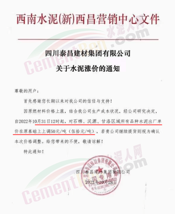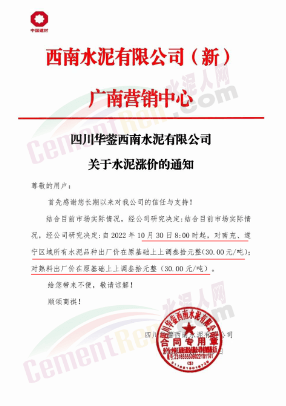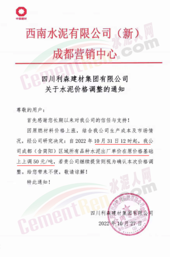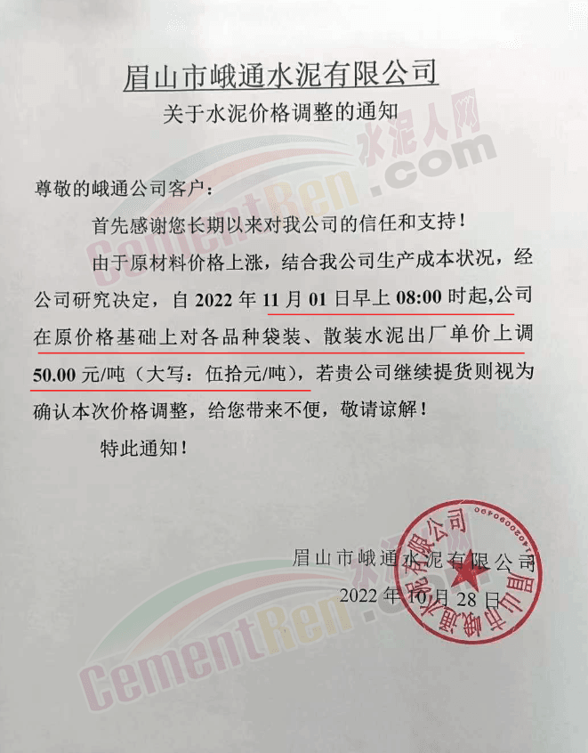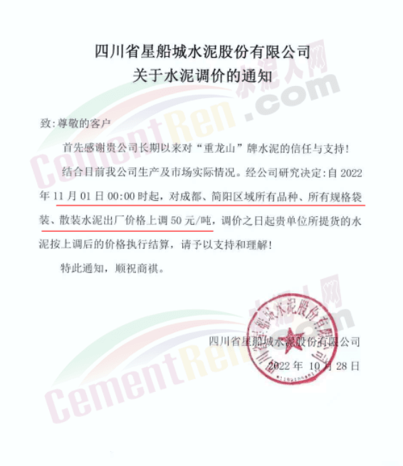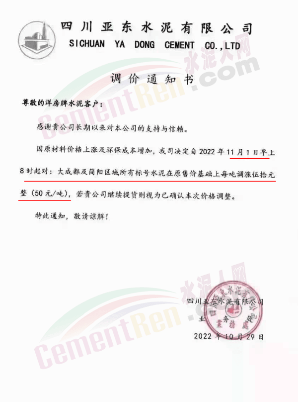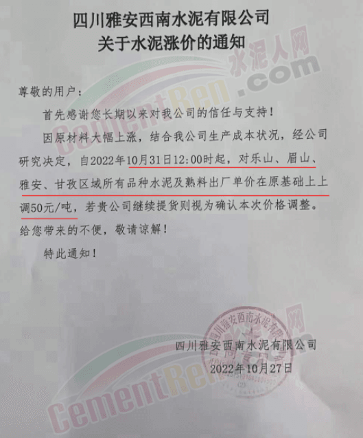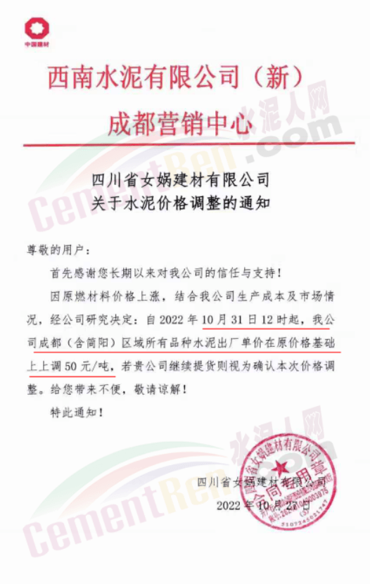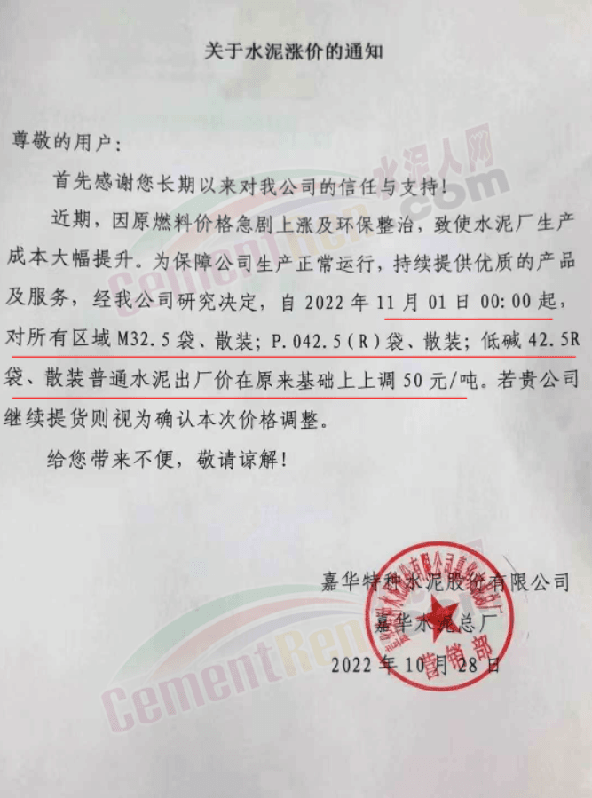 據(jù)了解,本輪調(diào)價(jià)是從10月30日起,包括粉磨站在內(nèi)的多家水泥企業(yè)通知上調(diào)水泥價(jià)格50元/噸,熟料價(jià)格同步上調(diào)30元/噸。