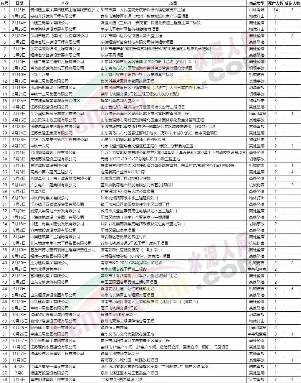 據(jù)水泥人網(wǎng)不完全統(tǒng)計(jì)2022年1月以來,高處墜落、機(jī)械傷害、坍塌等事故多發(fā)于在建項(xiàng)目工地,其中承建、總包企業(yè)不乏中建、中鐵集團(tuán)公司等公司旗下企業(yè)。