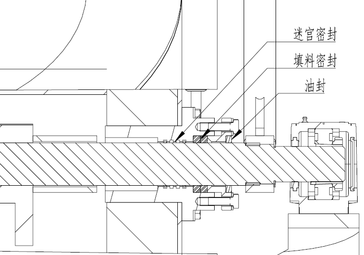 針對(duì)上述問(wèn)題,HJ新型翻板閥設(shè)計(jì)思路是將密封和轉(zhuǎn)動(dòng)兩個(gè)相互矛盾問(wèn)題拆開(kāi)后分別處理。由內(nèi)而外設(shè)置迷宮、填料、油封三層密封結(jié)構(gòu)(見(jiàn)圖3)。其中迷宮、油封結(jié)構(gòu)不直接與轉(zhuǎn)動(dòng)軸接觸,迷宮結(jié)構(gòu)內(nèi)部設(shè)置引流環(huán),可提前大幅度卸去沖擊到填料上面的瞬時(shí)正壓,由于接觸填料的瞬時(shí)正壓變低,填料密封的效果更加顯著。設(shè)置在最外端的油封既可以減少外部粉塵進(jìn)入填料,也可以再次降低漏料幾率。