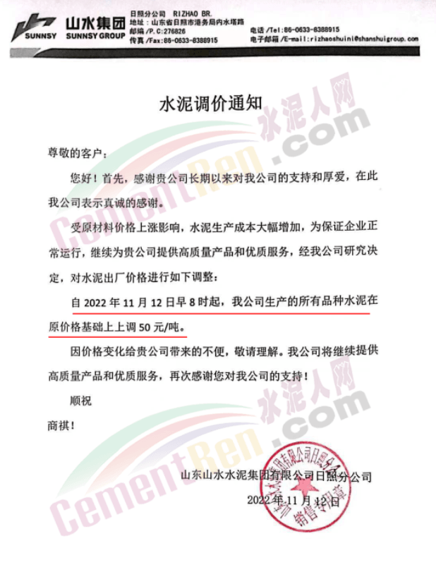山東山水水泥集團(tuán)有限公司日照分公司通知,受原材料價(jià)格上漲影響,水泥生產(chǎn)成本大幅增加,為保證企業(yè)正常運(yùn)行,自11月12日早8時(shí)起,上調(diào)水泥價(jià)格50元/噸。