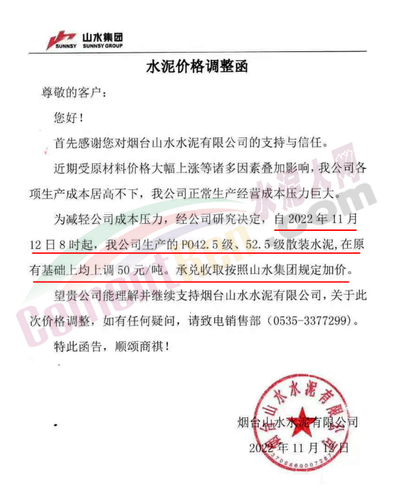 山東省煙臺(tái)山水水泥有限公司通知受原材料價(jià)格上漲影響,水泥生產(chǎn)成本大幅增加,為保證企業(yè)正常運(yùn)行。11月12日早8時(shí)起,公司生產(chǎn)的所有品種水泥在原價(jià)基礎(chǔ)上上調(diào)50元/噸。