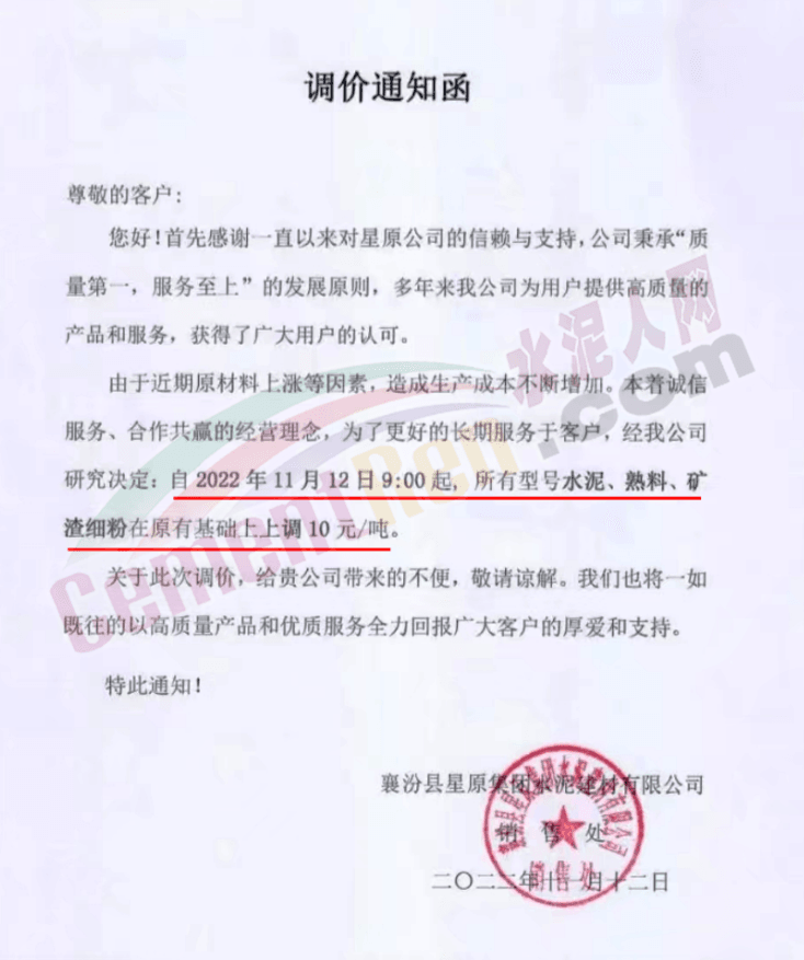 山西臨汾襄汾縣星原集陽水泥建材有限公司通知,由于近期原材料上漲等因素,造成生產(chǎn)成本不斷增加。經(jīng)公司研究決定,自2022年11月12日9:00起,所有型號(hào)水泥、熟料、礦渣細(xì)粉在原有基礎(chǔ)上上調(diào)10元/噸。