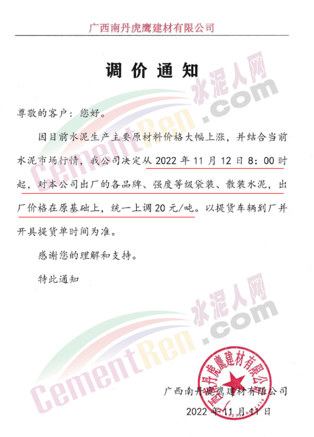 廣西壯族自治區(qū)河池市南丹縣廣西南丹虎鷹建材有限公司通知因目前水泥生產(chǎn)主要原材價(jià)格大幅上漲,并結(jié)合水泥市場行情 ,公司決定從11月12日8時(shí)起,對公司出廠的各品牌、強(qiáng)度等級水泥出廠價(jià)在原基礎(chǔ)上統(tǒng)一上調(diào)20元/噸。