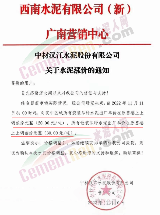 陜西省漢中市西南水泥廣南營銷中心中材漢江水泥通知結(jié)合目前市場實(shí)際情況,經(jīng)公司研究決定自11月11日8時(shí)起,對漢中區(qū)域所有袋裝品種水泥出廠單價(jià)上調(diào)20元/噸。所有散裝品種水泥出廠價(jià)上調(diào)30元/噸。