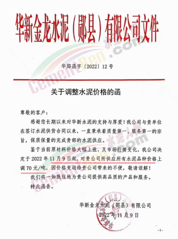 同期,湖北省十堰市華新金龍水泥(鄖縣)有限公司通知于11月9日起上調(diào)水泥價(jià)格70元/噸。