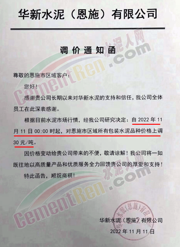 湖北省恩施土家族苗族自治州恩施市華新水泥(恩施)有限公司通知,根據(jù)當(dāng)前水泥市場行情經(jīng)公司研究決定,自11月11日0時(shí)起,對恩施區(qū)域所有包裝水泥價(jià)格上調(diào)30元/噸。